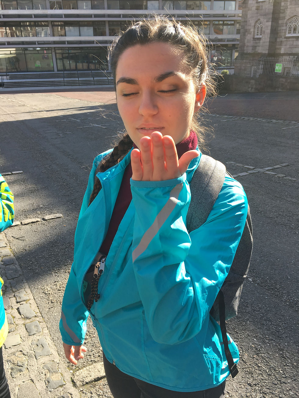 Nos levantamos, Nerea y yo, y fuimos a desayunar, la señora Bettina muy amablemente nos ofreció cereales y tostadas con mermelada (aún que Nerea prefiere la mantequilla). Después fuimos con nuestras compañeras Alexia e Irene al tren y llegamos a una zona céntrica en Dublin para encontrarnos con nuestros compañeros, los cuales vienen en bus.